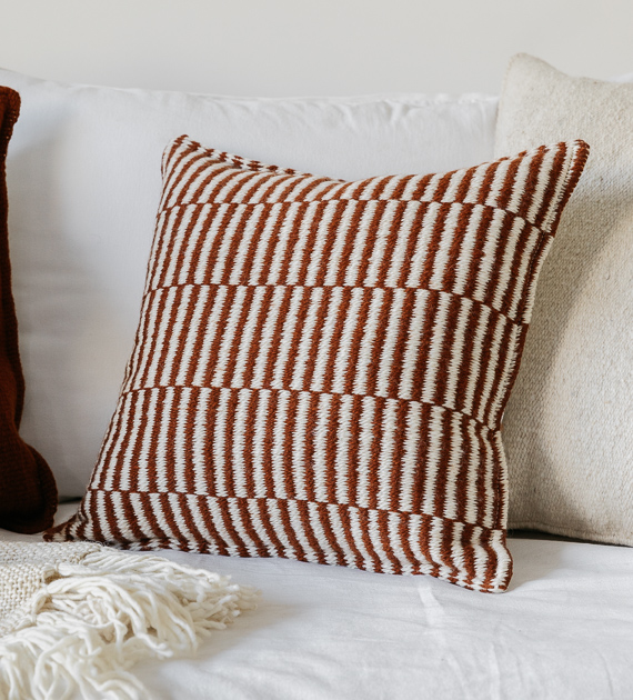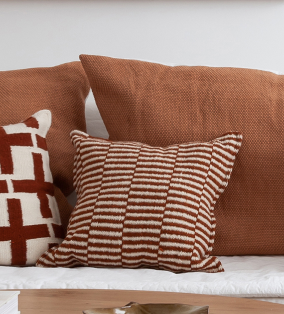 Los almohadones de la colección Valle están tejidos con lana, y se caracterizan por sus diseños de rayas, cruces y motivos geométricos, que aportan carácter y una identidad marcada al ambiente.