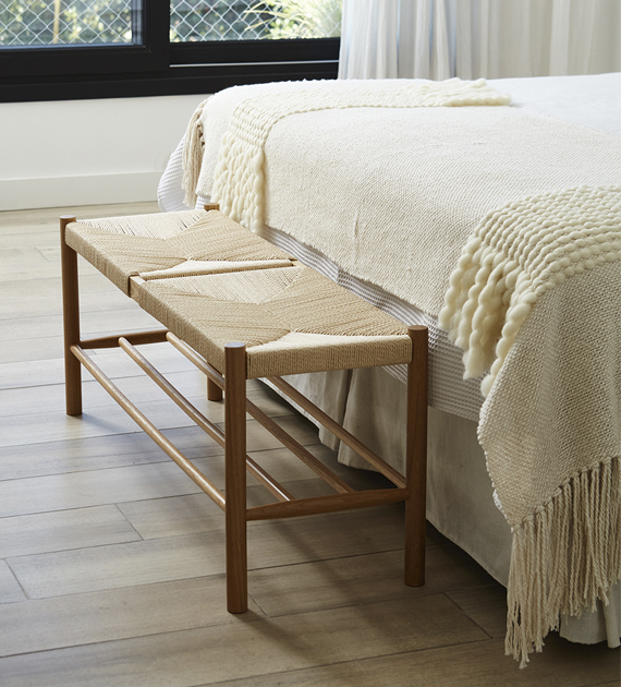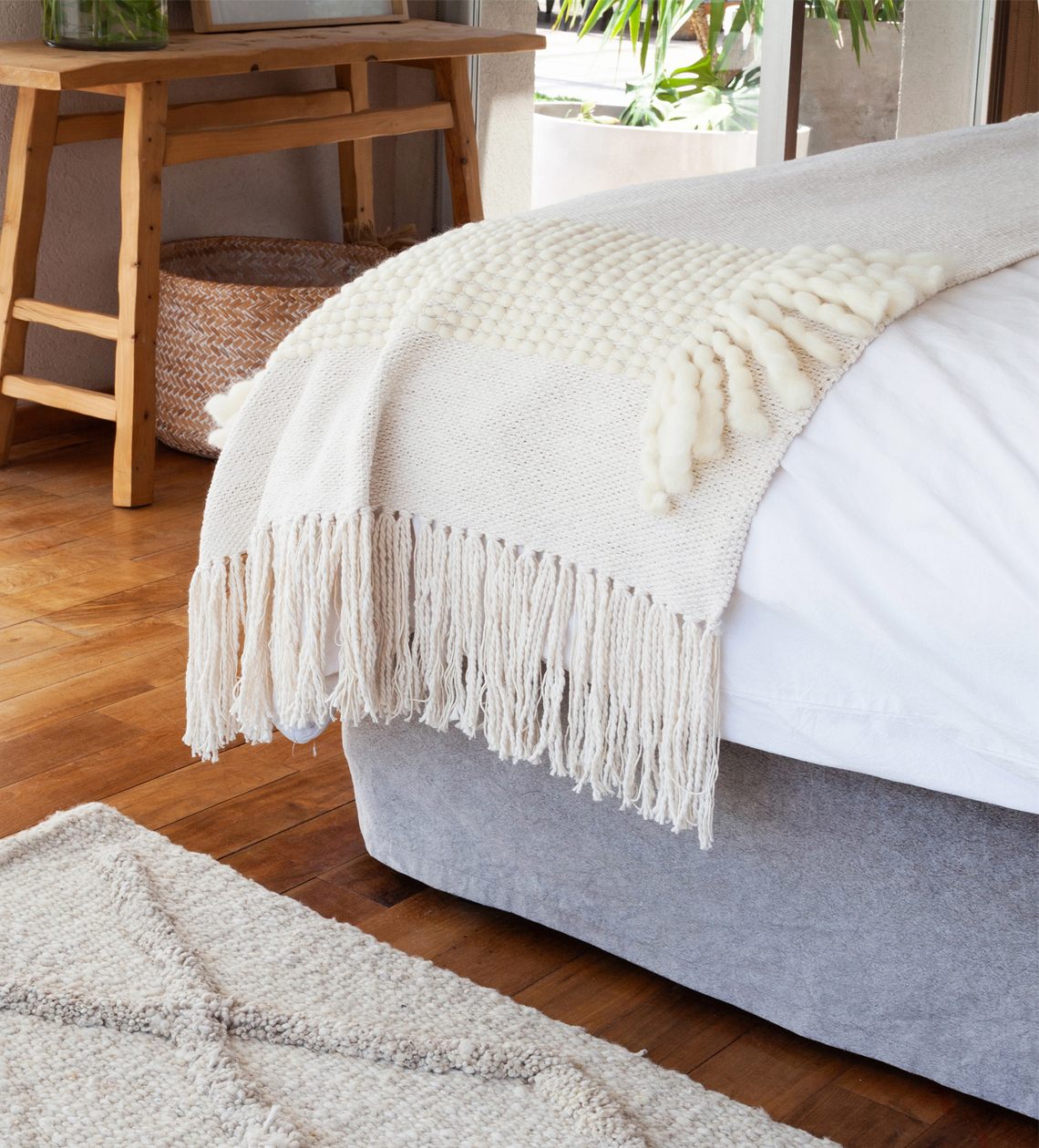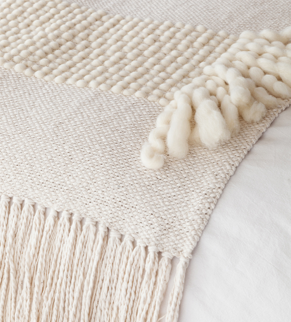 La Manta Tomy está tejida en telar de peine con algodón puro, con una guarda de lana merino que aporta contraste, textura y un detalle distintivo dentro del diseño.