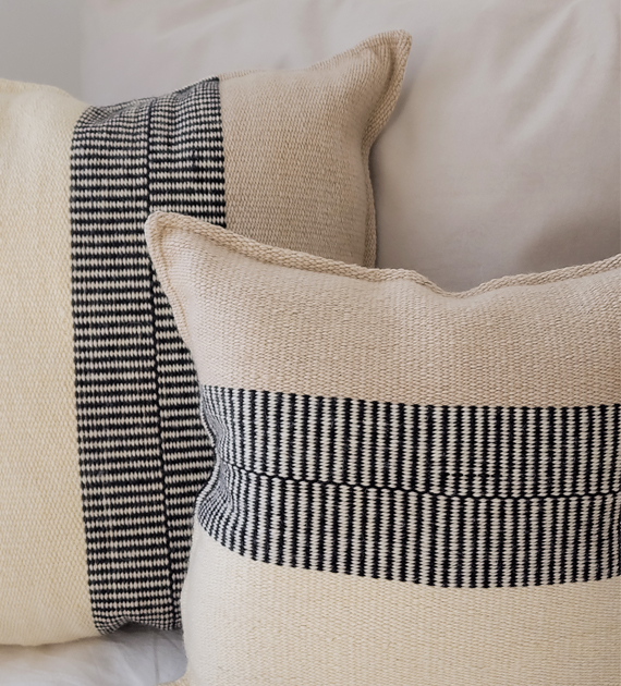 Los almohadones de la colección Valle están tejidos con lana, y se caracterizan por sus diseños de rayas, cruces y motivos geométricos, que aportan carácter y una identidad marcada al ambiente.