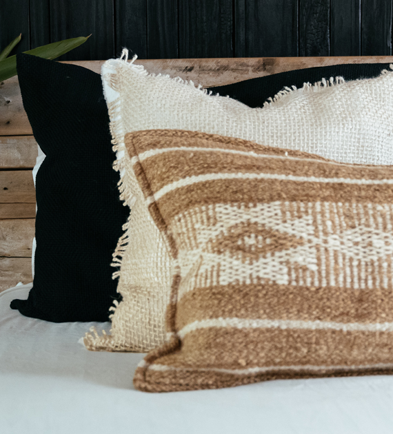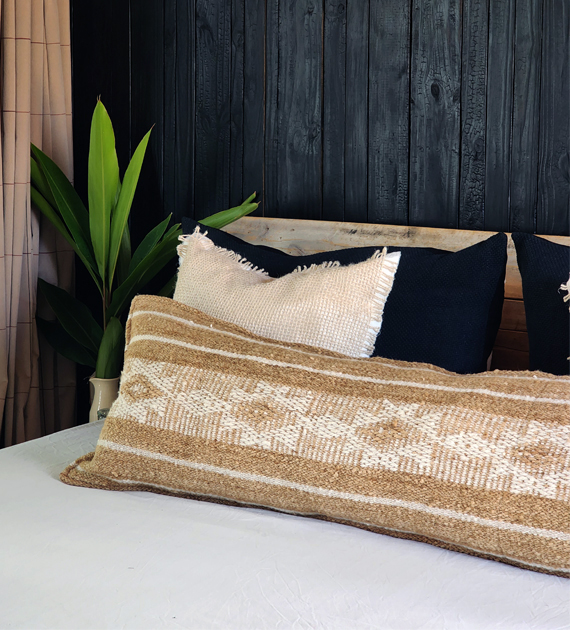 Almohadón rectangular xxl tejido en telar criollo con lana pura de oveja hilada a mano, una técnica tradicional que da origen a piezas únicas con diseño autóctono e identidad propia.