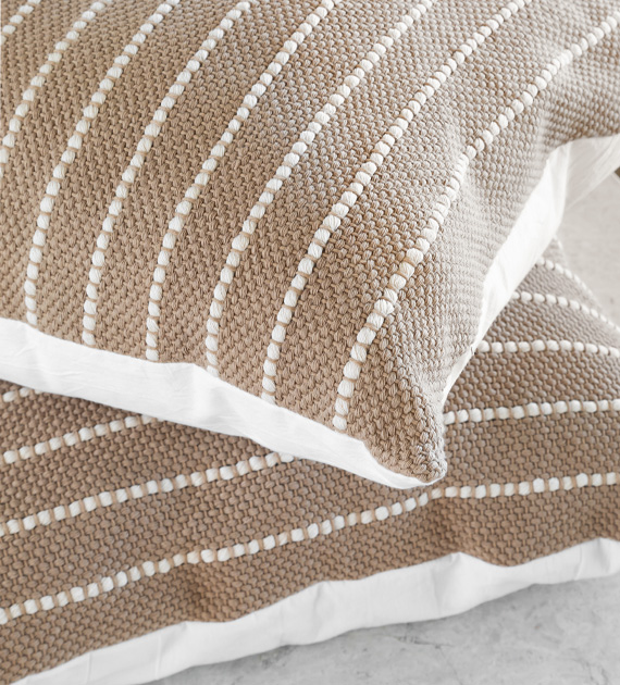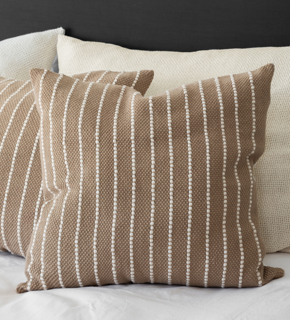 Almohadón cuadrado tejido en telar de peine con algodón puro, en tono moka mousse combinado con canelones en color natural. Una pieza equilibrada que aporta suavidad visual y armonía al ambiente.