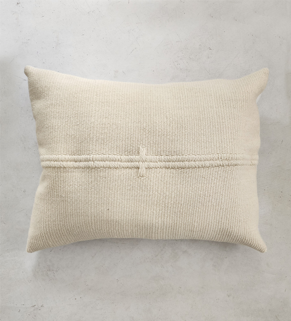 Almohadón rectangular tejido en telar criollo con lana pura de oveja hilada a mano. Contratapa en tusor 100% algodón color tiza.