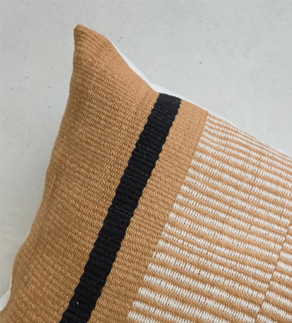 Almohadón cuadrado tejido en telar criollo con lana pura de oveja hilada a mano. La colección Hornillos se caracterizan por su diseño a rayas delicadas, que aporta ritmo y sutileza visual sin sobrecargar el ambiente.