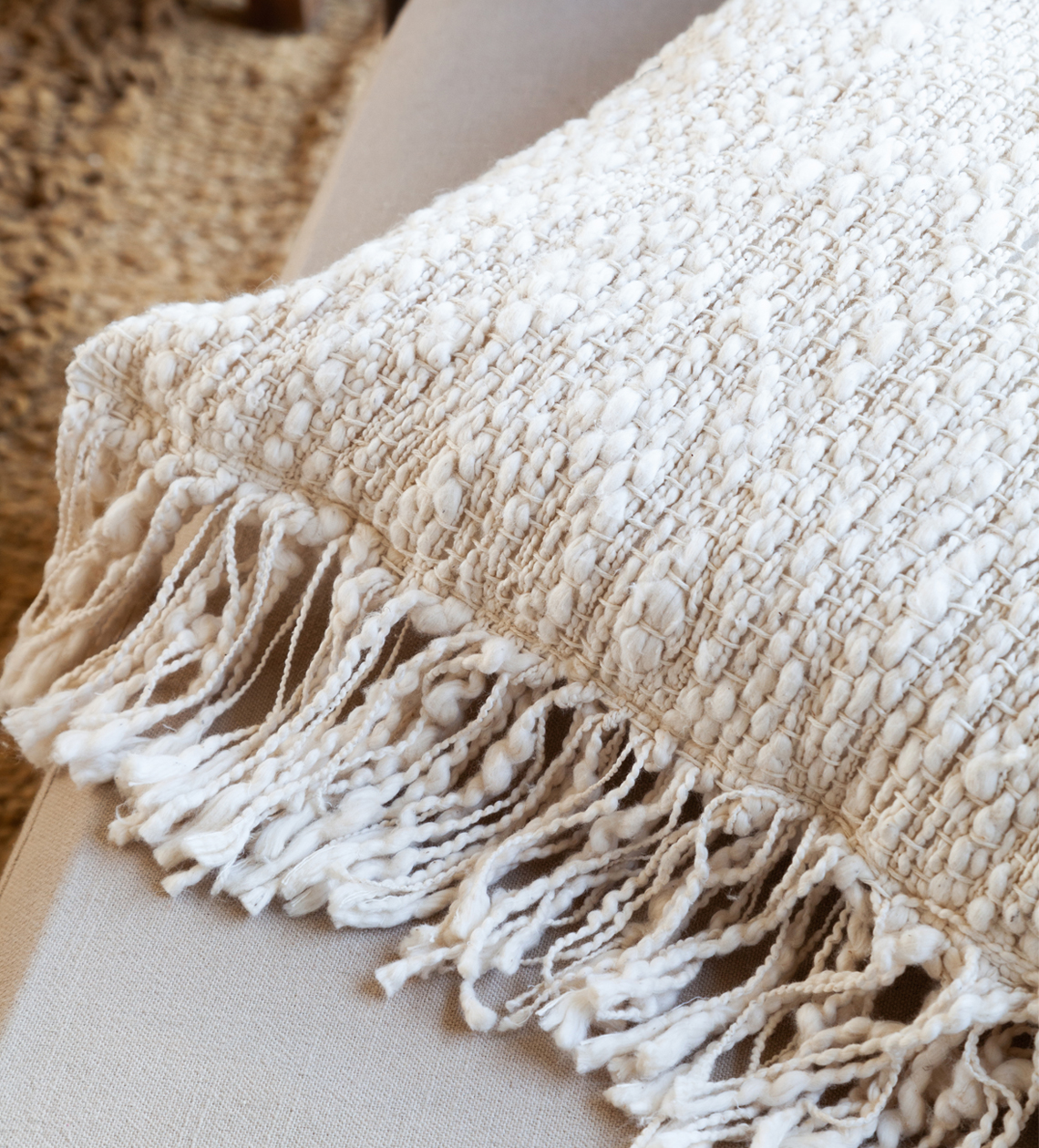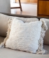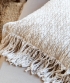 Almohadón cuadrado con flecos. Los almohadones Tramas de Algodón están tejidos con hilo de algodón en la urdimbre y algodón flamé en la trama, una combinación que aporta una textura sutil, con relieve delicado y un aspecto liviano.