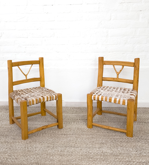 Set x 2 sillas materas realizadas en madera de chañar recuperada de podas, con asiento de tiento tejido a mano. Cada pieza se elabora bajo un proceso totalmente hecho a mano, respetando los tiempos y técnicas tradicionales.