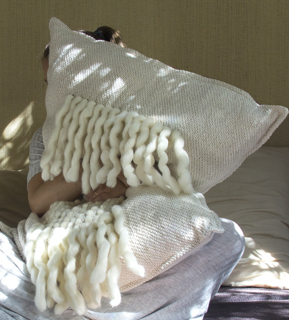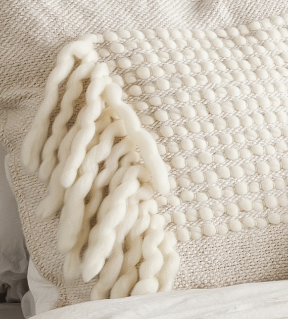 Almohadón rectangular tejido en telar de peine con algodón puro y lana merino. Los almohadones de la colección Tomy se distinguen por su guarda de lana merino dejando flecos, un detalle que aporta contraste, textura y una identidad sutil.
