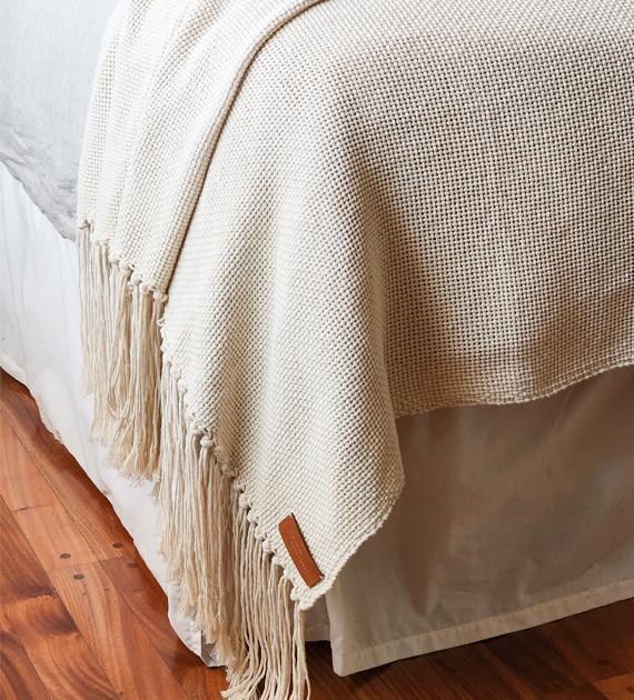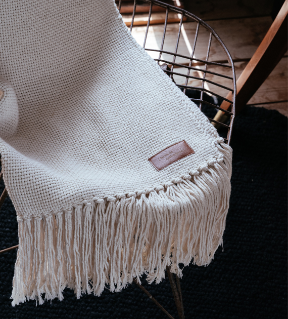 La Manta Filomena está tejida en telar de peine con algodón puro, en tonos neutros y versátiles que permiten combinarla con distintas paletas y estilos.