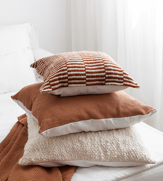Almohadón cuadrado tejido en telar de peine con algodón puro. Los almohadones Filomena están tejidos en tonos neutros y versátiles, pensados para combinar con todas nuestras colecciones y adaptarse con facilidad a distintos estilos y paletas.