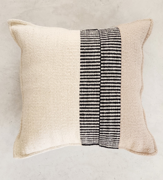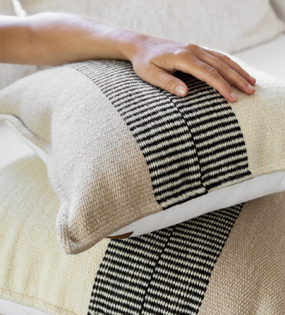 Los almohadones de la colección Valle están tejidos con lana, y se caracterizan por sus diseños de rayas, cruces y motivos geométricos, que aportan carácter y una identidad marcada al ambiente.