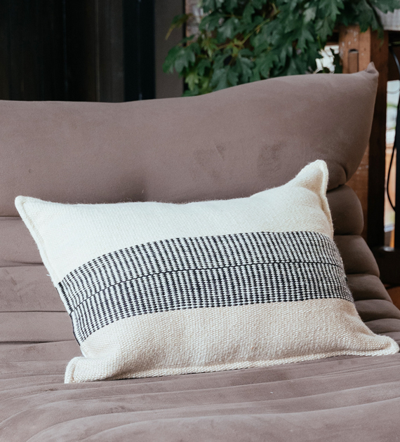 Los almohadones de la colección Valle están tejidos con lana, y se caracterizan por sus diseños de rayas, cruces y motivos geométricos, que aportan carácter y una identidad marcada al ambiente.