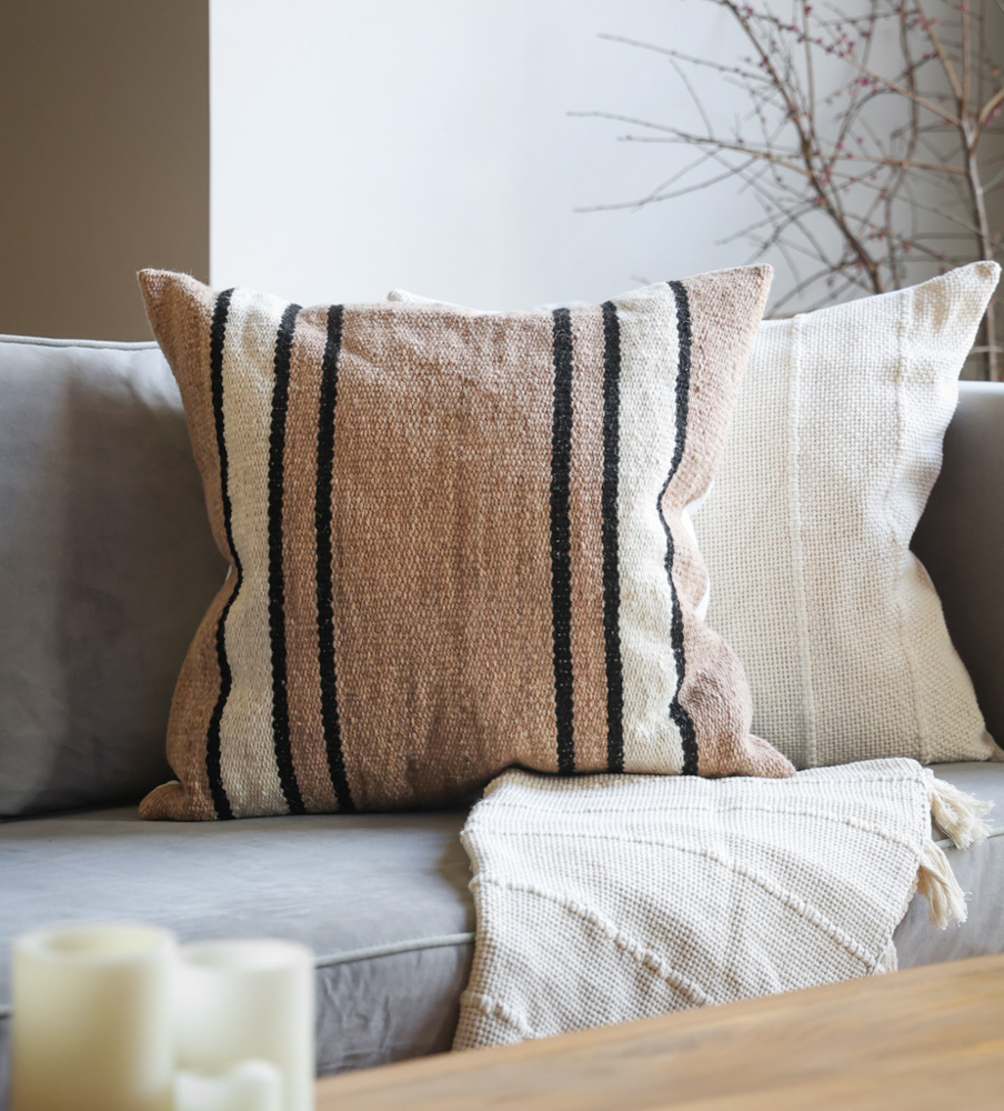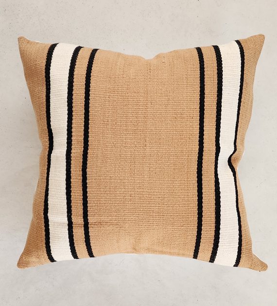 Almohadón cuadrado tejido en telar criollo con lana pura de oveja hilada a mano. La colección Hornillos se caracterizan por su diseño a rayas delicadas, que aporta ritmo y sutileza visual sin sobrecargar el ambiente.