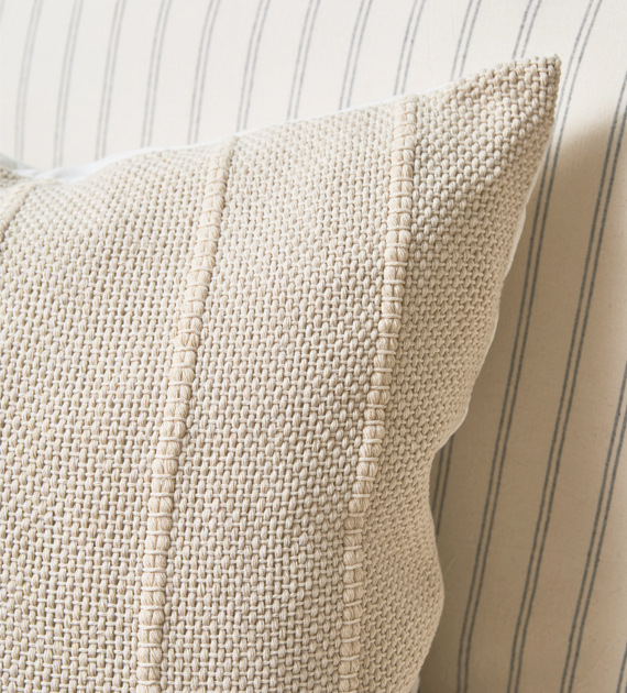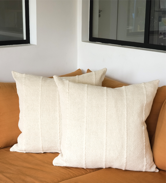 Almohadón cuadrado tejido en telar de peine con algodón puro, en tono natural. Los canelones también en tono natural aportan textura y relieve, sumando interés visual sin perder neutralidad. Una pieza equilibrada que transmite frescura y armonía, fácil de combinar en distintos ambientes.